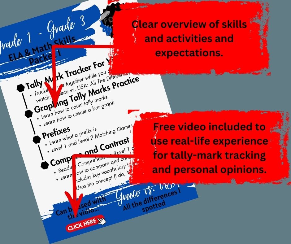 👋 If you choose to watch the video… Explore essential ELA and Math Skills while using my compare and contrast of the incredible differences I noticed between Greece and the United States through the lens of tally marks! 📊✏️ Perfect for homeschooling enthusiasts and tailored for Grades 1-3.