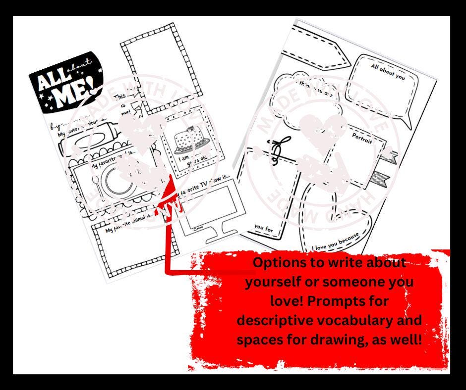 Project Sheets: Let your child write about themselves or someone they love with fun prompts, like “Write about Me” or “Write about You.”